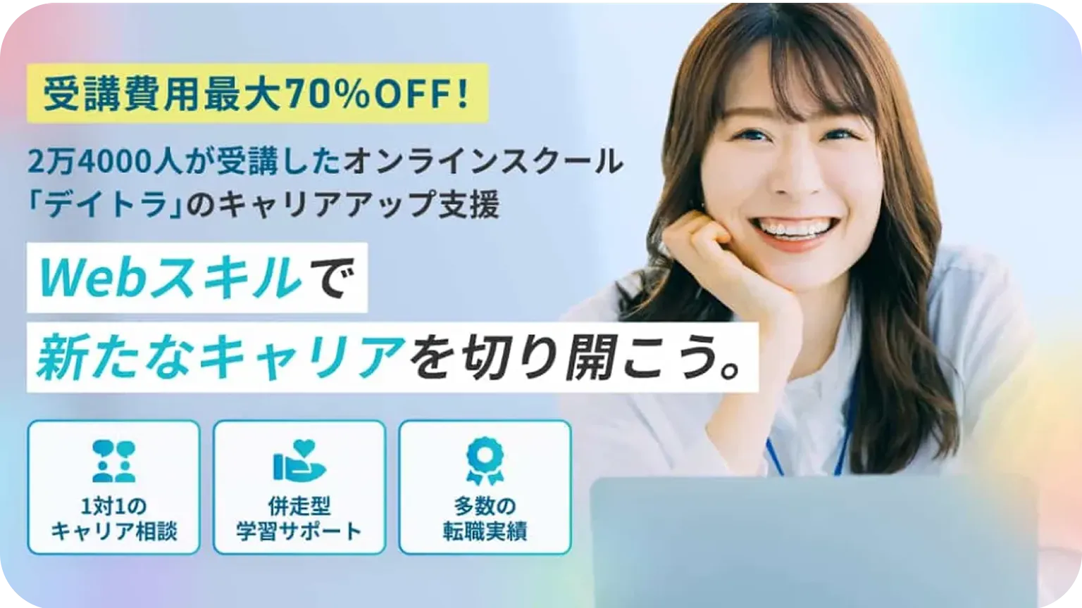 1日の学習はたった1時間、2週間でサクッと完了できるコンパクト設計。1動画15分以内だから、忙しい日のスキマ時間でも無理なく学習を進められます。3万人が学んだデイトラの品質で、あなたの学びをサポートします。